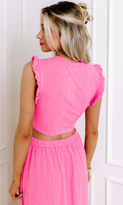 Conjunto de falda larga y top corto con ribete de volantes texturizado rosa
