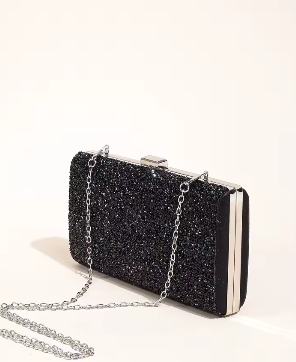 Ya sea para una boda, una fiesta nocturna, o una gala formal, esta bolsa de fiesta se convierte en el accesorio ideal para complementar cualquier outfit. Su diseño compacto permite llevar lo esencial, como tu teléfono, tarjetas y maquillaje, sin perder su sofisticado carácter. La combinación de pedrería y cadena logra un balance perfecto entre elegancia y funcionalidad, permitiéndote lucir impecable durante todo el evento.