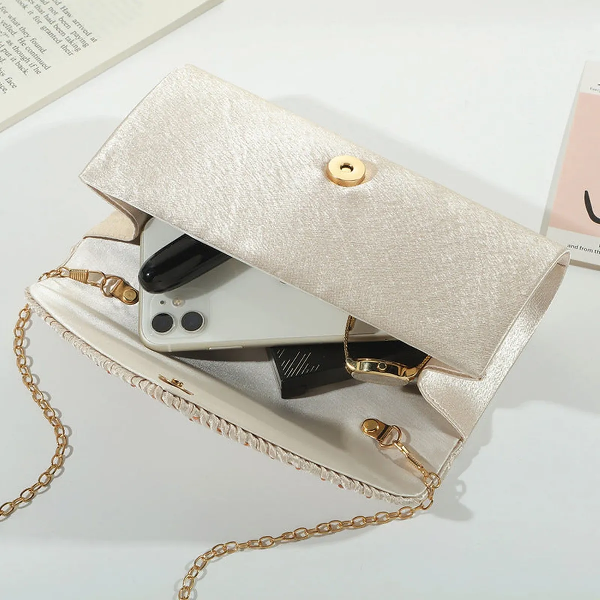 Esta bolsa no solo se caracteriza por su elegancia, sino también por su practicidad. La correa de cadena desmontable permite llevarla como una bolsa de mano o colgada al hombro, dependiendo de la ocasión y tu preferencia. Su tamaño compacto te facilita llevar lo esencial, como tu teléfono, maquillaje, cartera, y llaves, mientras mantiene una apariencia estilizada y sin abultamientos.