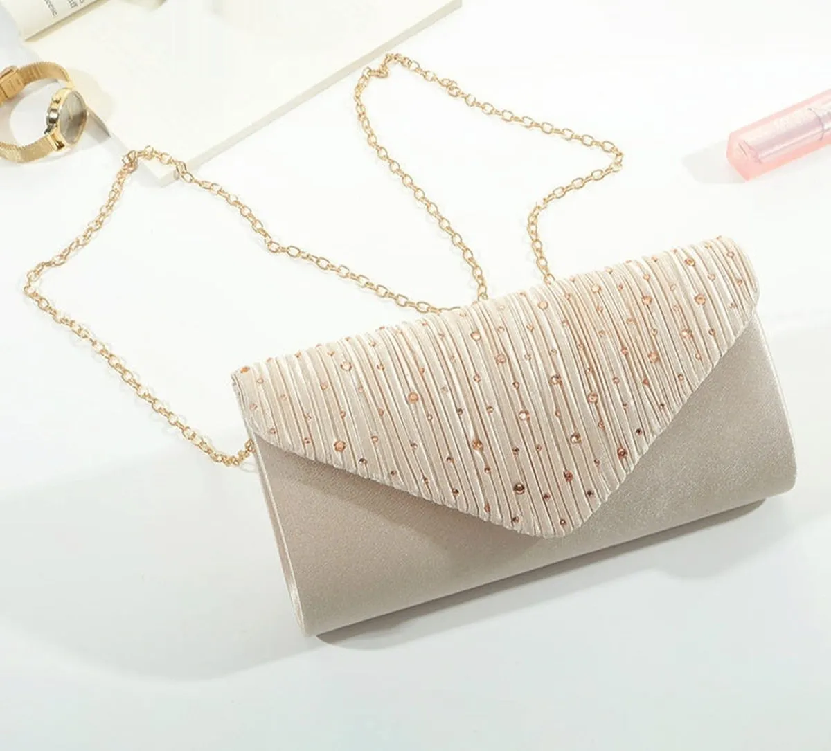 La bolsa de fiesta con pedrería de mano y correa de cadena es un accesorio imprescindible para tus eventos especiales. Diseñada con un detallado trabajo de pedrería que añade un toque de lujo y sofisticación, esta bolsa es ideal para complementar tu atuendo y destacar entre la multitud. Tanto si asistes a una boda, gala o una fiesta nocturna, este producto combina estilo y funcionalidad en un formato compacto y atractivo.