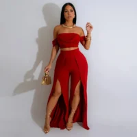 El top con strapless incluye una manga que agrega un toque asimétrico único, realzando la silueta y aportando un estilo contemporáneo. Por otro lado, el pantalón maxi de pierna ancha brinda libertad de movimiento y comodidad, siendo una pieza esencial para quienes aprecian tanto la funcionalidad como la moda. La abertura en la pierna contribuye con un detalle atractivo, que aporta sensualidad y elegancia al conjunto sin ser excesivo.