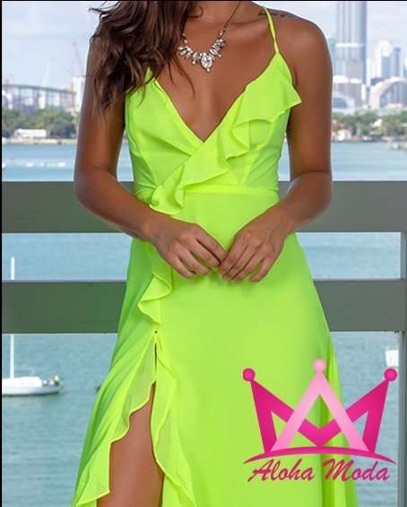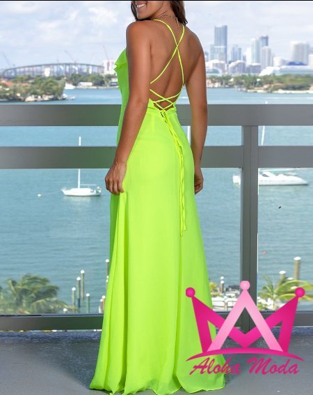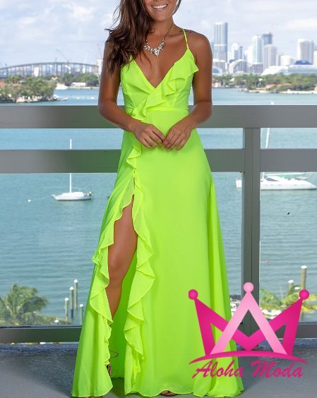 Fabricado con materiales ligeros y de alta calidad, este vestido maxi no solo realza tu silueta, sino que también garantiza comodidad durante toda la velada. Su escote en V combina sensualidad y elegancia, mientras que los tirantes mantienen la frescura y seguridad. Los olanes añaden un toque de sofisticación dinámica, y la abertura en la pierna proporciona libertad de movimiento sin comprometer el glamour.