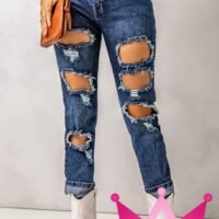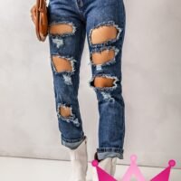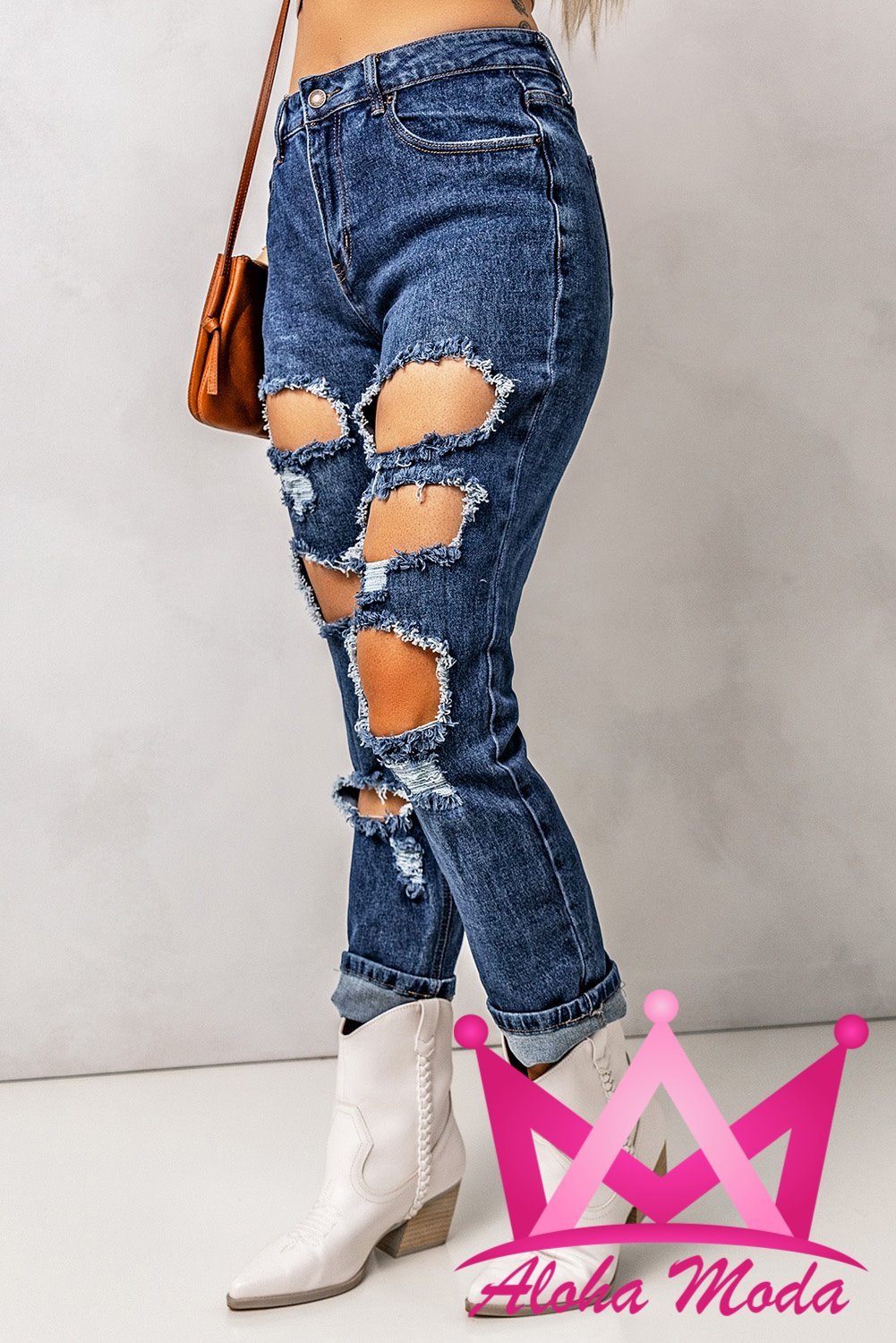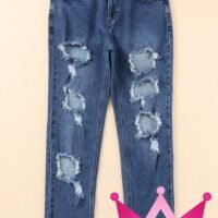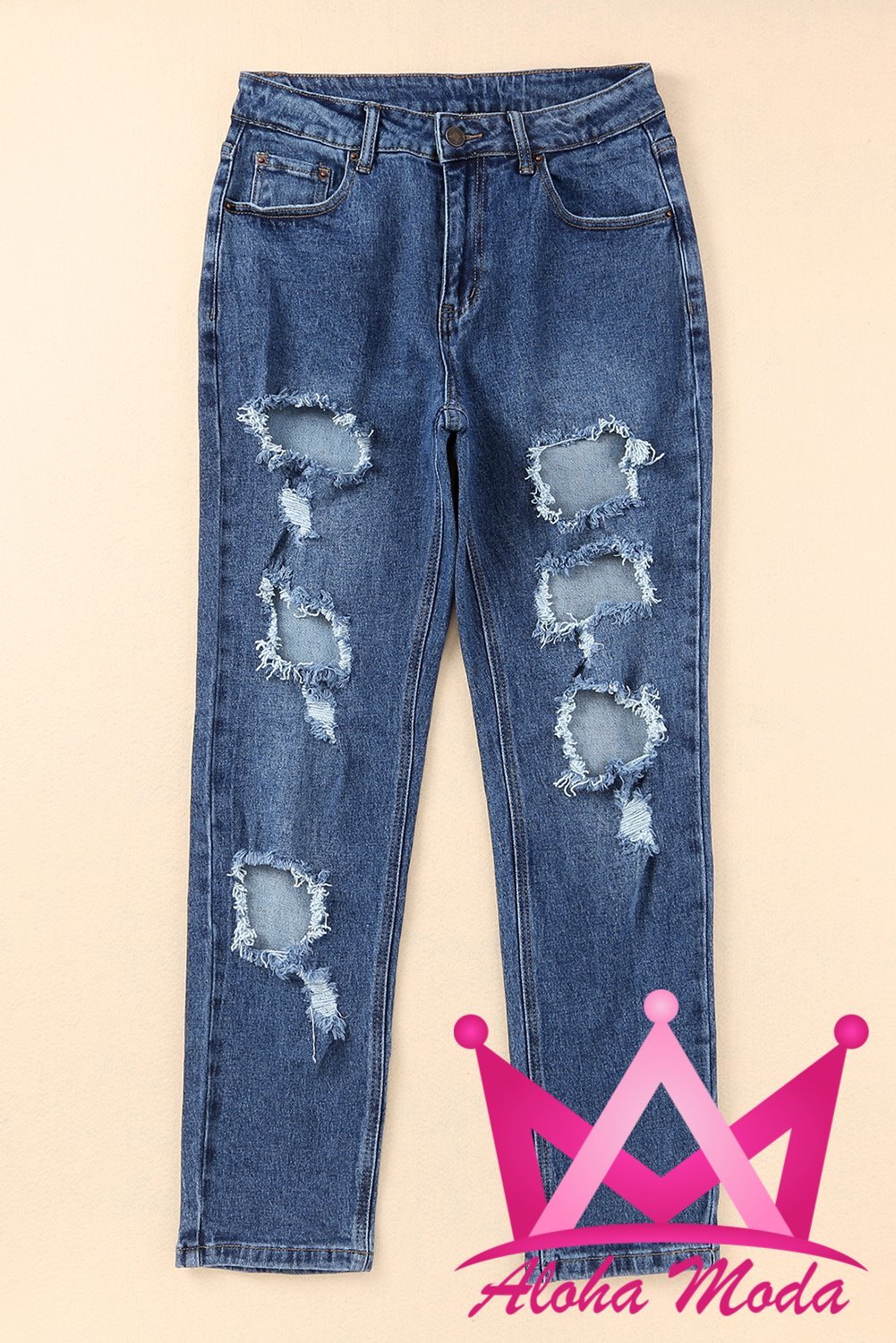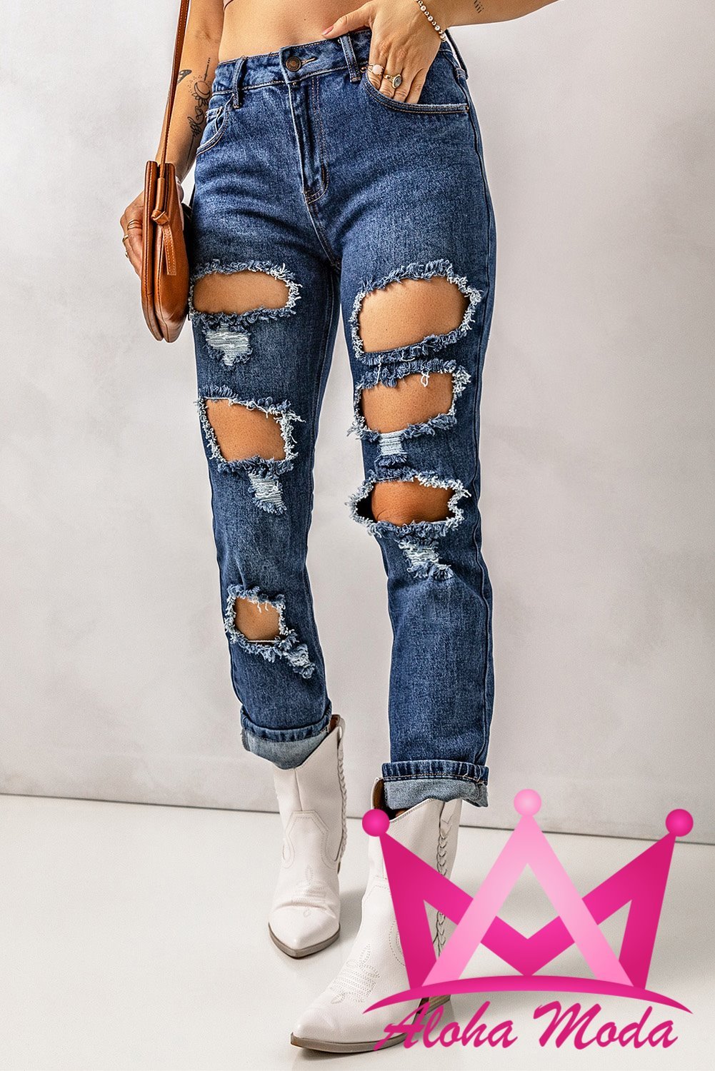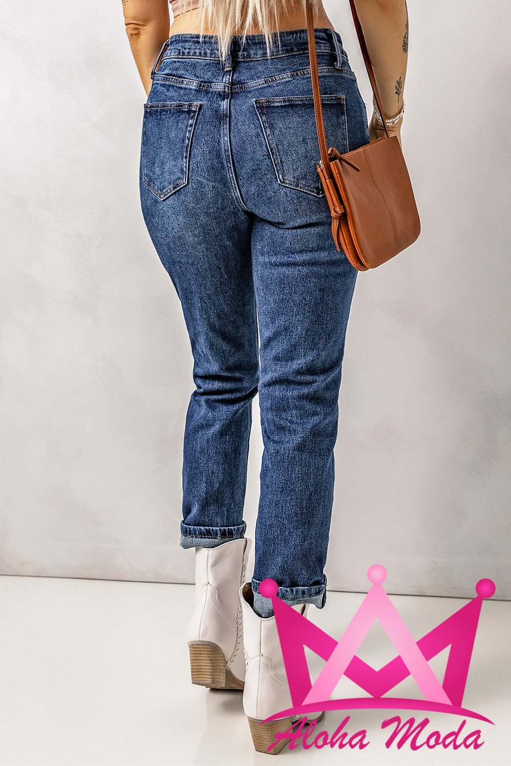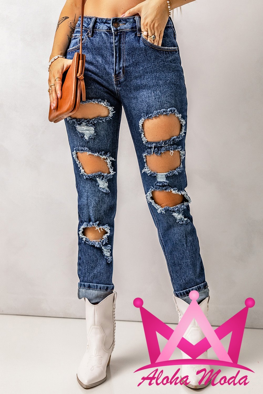 Los jeans de pierna recta rasgados color azul de mezclilla son una opción atemporal que se adapta a cualquier estilo. Con su diseño clásico de pierna recta y un toque moderno de rasgado, se convierten en una pieza imprescindible para cualquier guardarropa. Perfectos tanto para un día casual como para una noche informal, estos jeans te ofrecen versatilidad y comodidad.