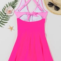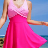 En resumen, el traje de baño de una pieza acampanado con tirantes cruzados y lazo en la espalda en color rojo rosa es una elección perfecta para aquellas que valoran estilo, comodidad y funcionalidad en su vestuario para el verano. Date el gusto de lucir espectacular en tu próxima aventura junto al agua y haz que cada momento cuente con este diseño increíble.