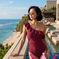 Fabricado con materiales de alta calidad, este traje de baño color vino no solo luce increíble, sino que también es suave al tacto y cómodo de llevar. Perfecto para largas jornadas bajo el sol o relajantes días junto a la piscina.