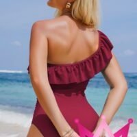 Descubre el traje de baño de una pieza que redefine la moda en playa. Con su corte asimétrico y detalles de volantes, este diseño ofrece un aire moderno y sofisticado que te hará destacar en cualquier ocasión.