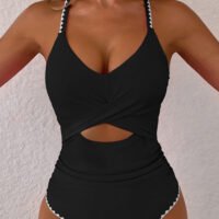 El elemento distintivo de este traje de baño es su patrón de patchwork negro, que combina diferentes texturas y acabados para un look único. Este diseño asegura que destaques a donde quiera que vayas, ya sea en la playa, en la piscina, o incluso durante una escapada tropical con amigos. Los recortes cuidadosamente colocados añaden un toque moderno y atrevido, permitiendo que la prenda abra un diálogo entre sofisticación y audacia.