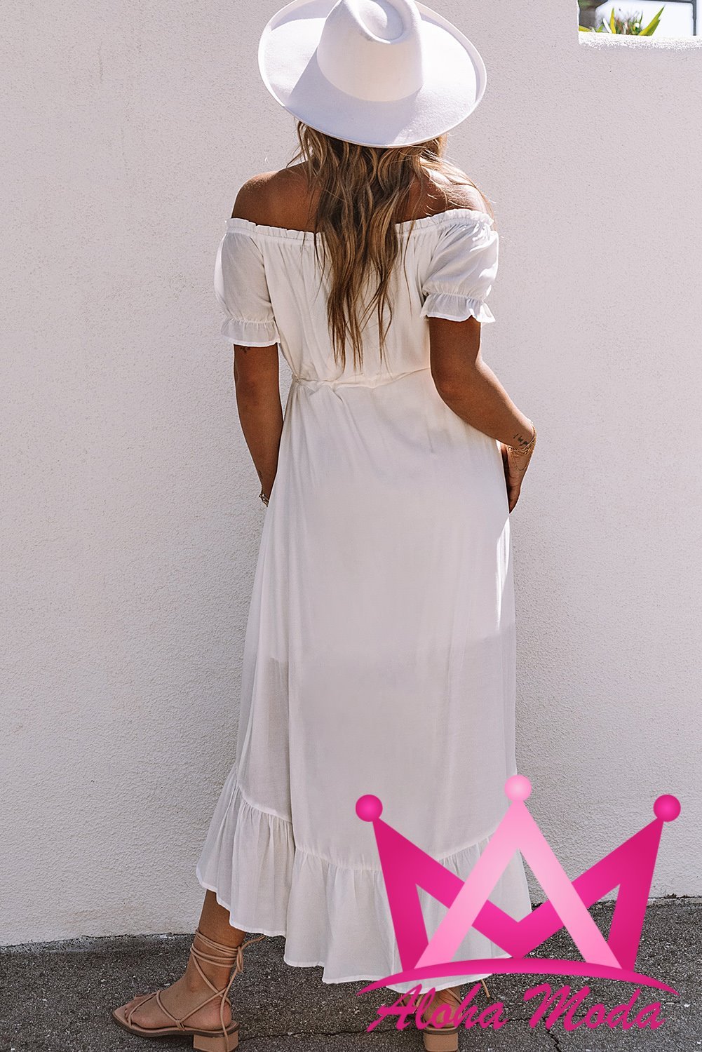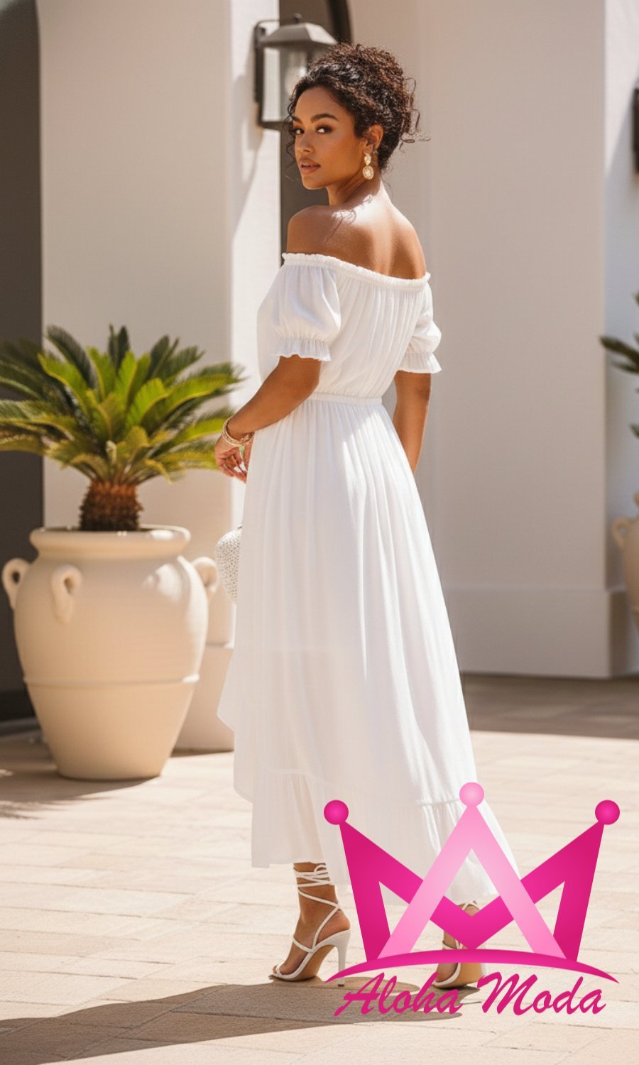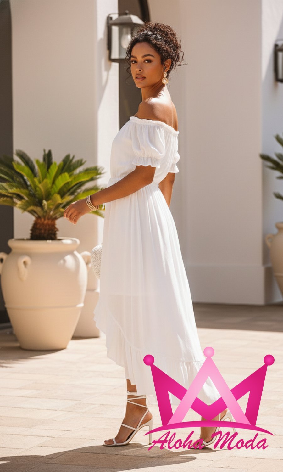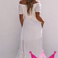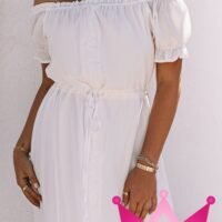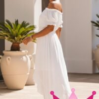 El Vestido midi blanco corte asimétrico con manga corta y hombros descubiertos está diseñado pensando en la mujer moderna que busca destacar con elegancia y frescura. Su corte asimétrico ofrece un toque de originalidad que lo convierte en una pieza única para cualquier evento, desde reuniones informales hasta celebraciones especiales.