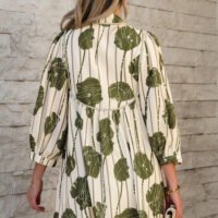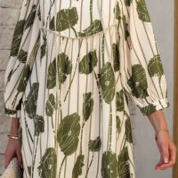 Ya sea una reunión familiar, una fiesta con amigos o un paseo casual, este vestido color verde con estampado floral y rayas te hará destacar por su encanto y originalidad. Combínalo con accesorios como collares delicados o pendientes llamativos para completar tu look. También es perfecto con zapatos desde sandalias hasta tacones, dependiendo del estilo que desees proyectar.