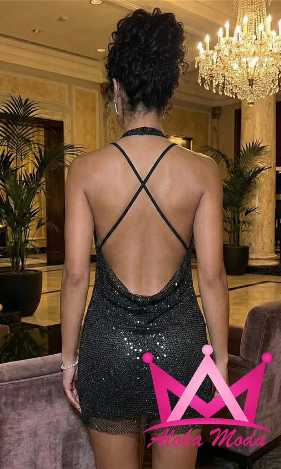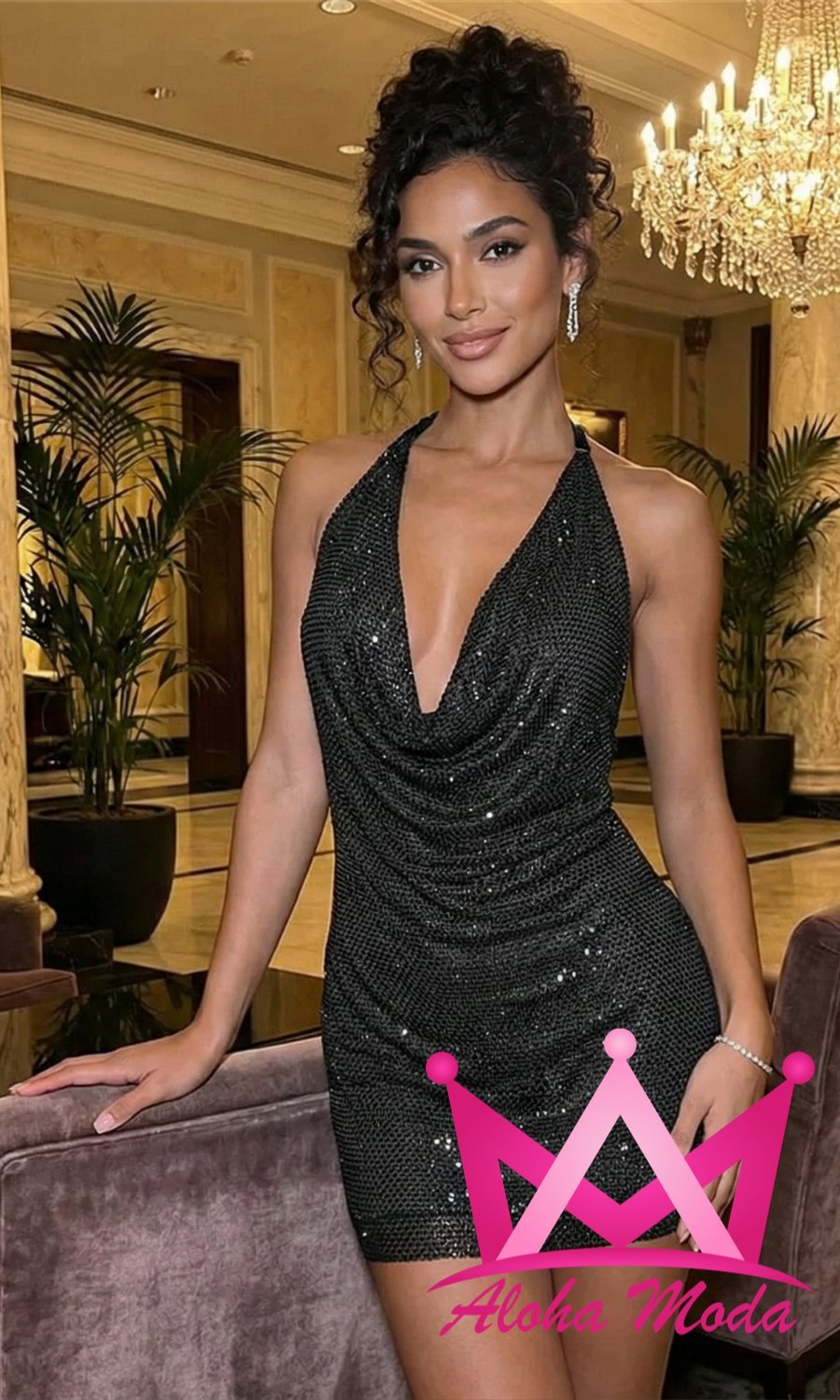 Este vestido corto negro es la elección perfecta para deslumbrar. Su acabado brillante con efecto de pedrería eleva tu estilo, haciéndote destacar en cualquier evento especial o noche elegante. La combinación de lujo y sofisticación es insuperable.