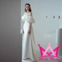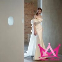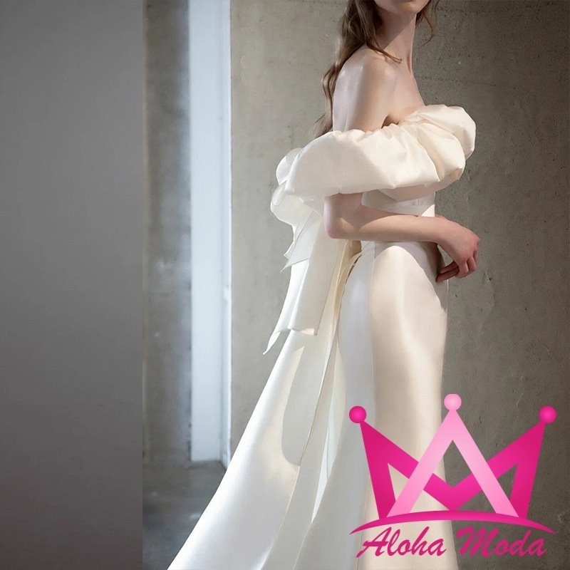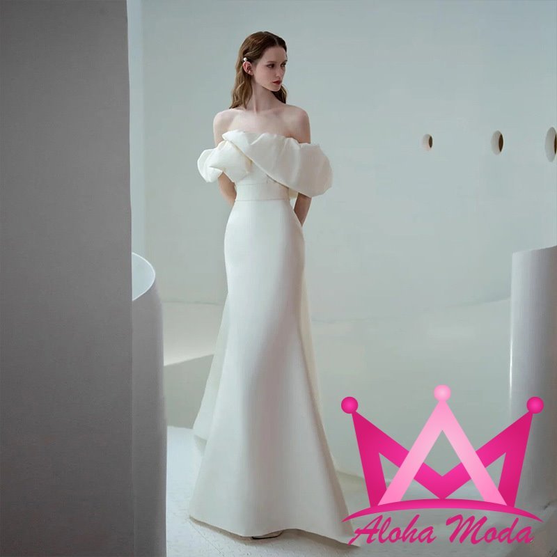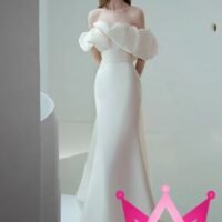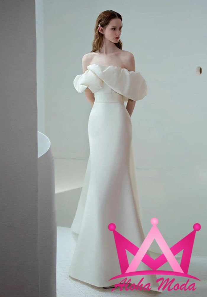 El diseño de hombros descubiertos otorga un toque romántico que realza la belleza natural de quien lo lleva. Confeccionado en materiales de alta calidad, este vestido ofrece una textura suave y cómoda, ideal para un largo día de celebración. Su color blanco puro simboliza la elegancia y la tradición, mientras el corte ajustado es perfecto para quienes buscan destacar con una figura esbelta y estilizada.