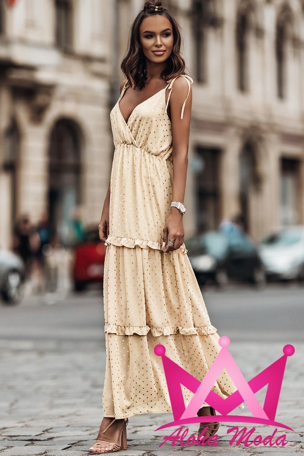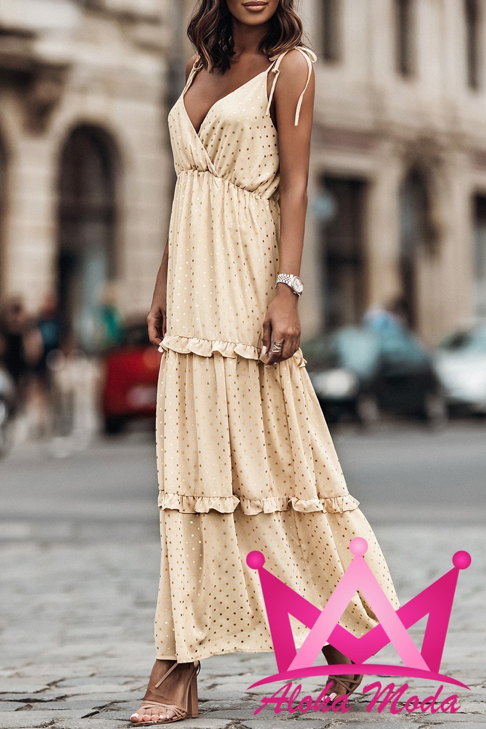 Para lucir tu Vestido Largo Beige con Puntos Dorados de la mejor manera, te sugerimos combinarlo con tacones nude o dorados para alargar visualmente las piernas. Puedes optar por un cinturón delgado que destaque tu cintura y agregar un bolso de mano elegante para un toque final. En cuanto al cuidado, se recomienda lavar a mano o en ciclo suave en la lavadora y secar al aire para preservar su acabado y color. Así, garantizarás que tu vestido se mantenga en perfectas condiciones para cada vez que lo necesites.