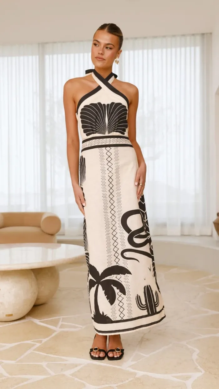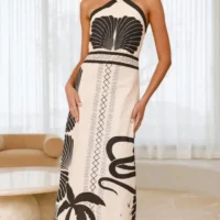 Descubre el encanto del vestido largo sin mangas con cuello halter, pensado para ser tu mejor elección en cualquier evento. Este modelo combina sofisticación y frescura en un diseño único que destaca por su estampado estilizado de palmeras, cactus y patrones geométricos. La combinación de tonos blanco y negro le otorga un aire elegante y versátil, perfecto para quien busca comodidad sin renunciar al estilo.