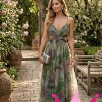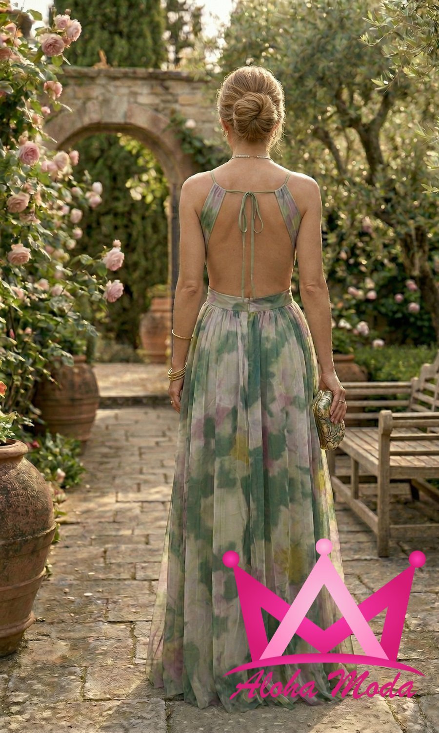 Disponible en estampado tropical verde y amarillo, este vestido te transporta a un paraíso exótico desde el momento en que lo usas. Su diseño llamativo y colores vibrantes son ideales para eventos diurnos o noches relajadas bajo las estrellas.