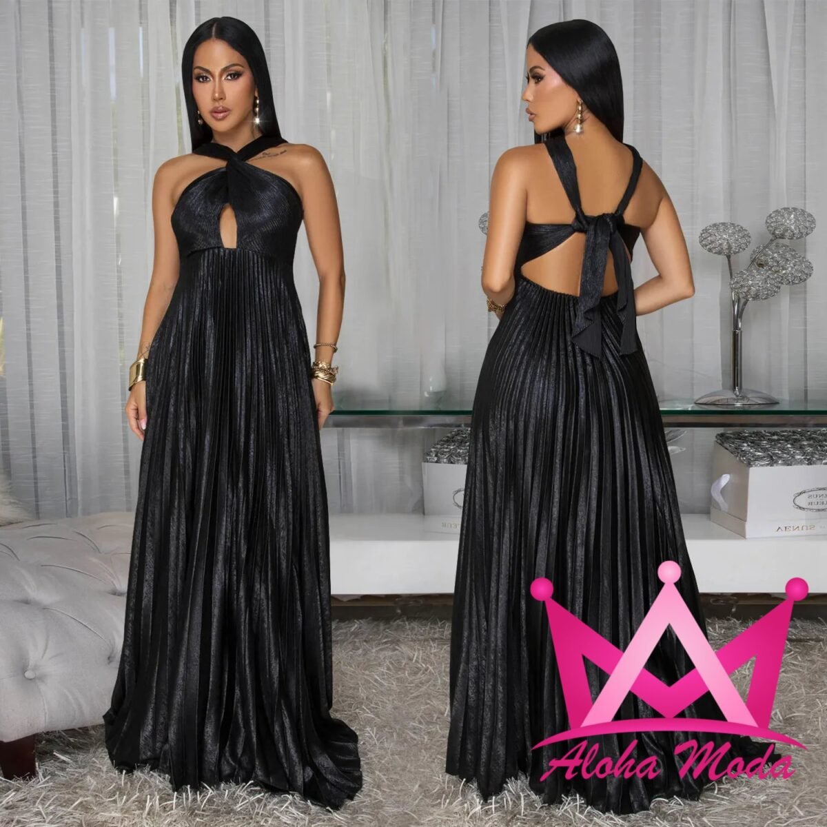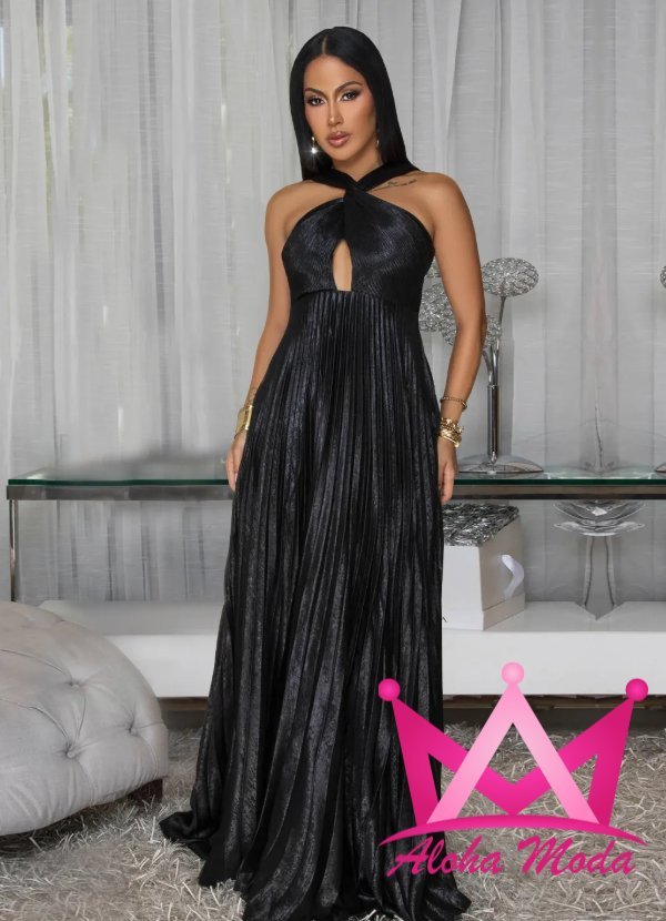 Este precioso vestido largo luce un cautivador escote halter, bellamente trenzado para un toque de sofisticación. La falda fluida y plisada aporta un toque de fantasía y movimiento, asegurándote de lucir y sentirte espectacular toda la noche. La tela negra brillante irradia un aire de misterio y encanto, lo que lo convierte en la opción ideal para eventos nocturnos, fiestas o incluso una cena sofisticada. El vestido está cuidadosamente confeccionado para realzar tu figura, realzando tus mejores rasgos y brindándote un ajuste cómodo y natural.