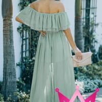 El vestido está elaborado con un tejido suave y ligero, diseñado para brindarte máxima comodidad mientras realza tu silueta. La abertura en la pierna proporciona movilidad y agrega un detalle atrevido al diseño, mientras que los hombros descubiertos ofrecen un toque femenino y coqueto. Su tonalidad verde, fresca y vibrante, complementa diferentes tonos de piel y estilos personales.